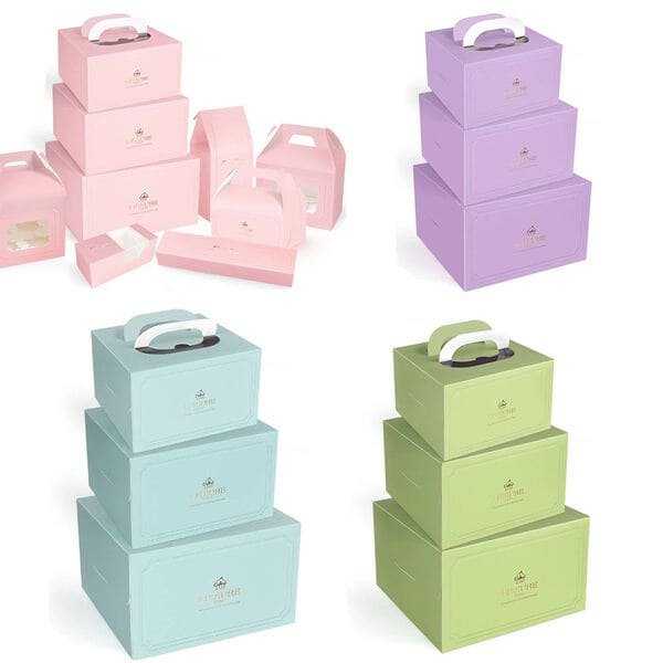 Baking boxes are used to package cakes, cupcakes, biscuits, chocolates, bread, doughnuts, macarons and other desserts. Made of food grade material and printed with soy ink